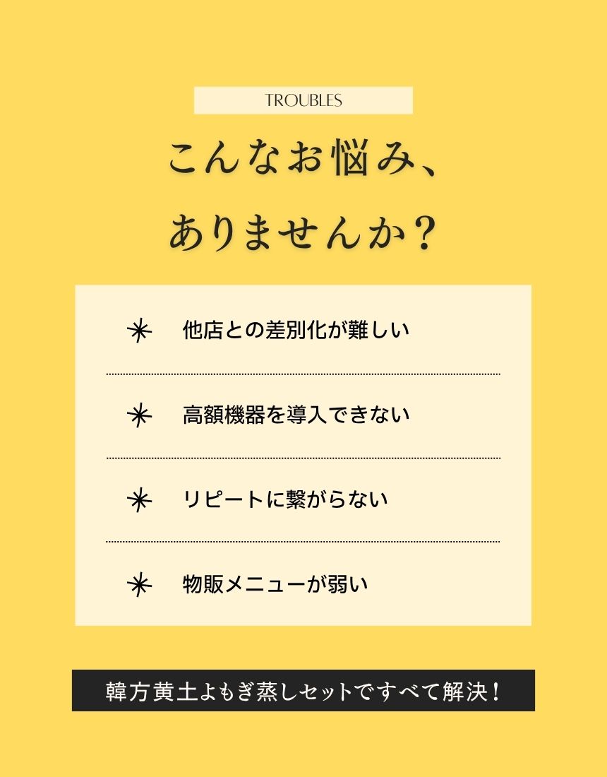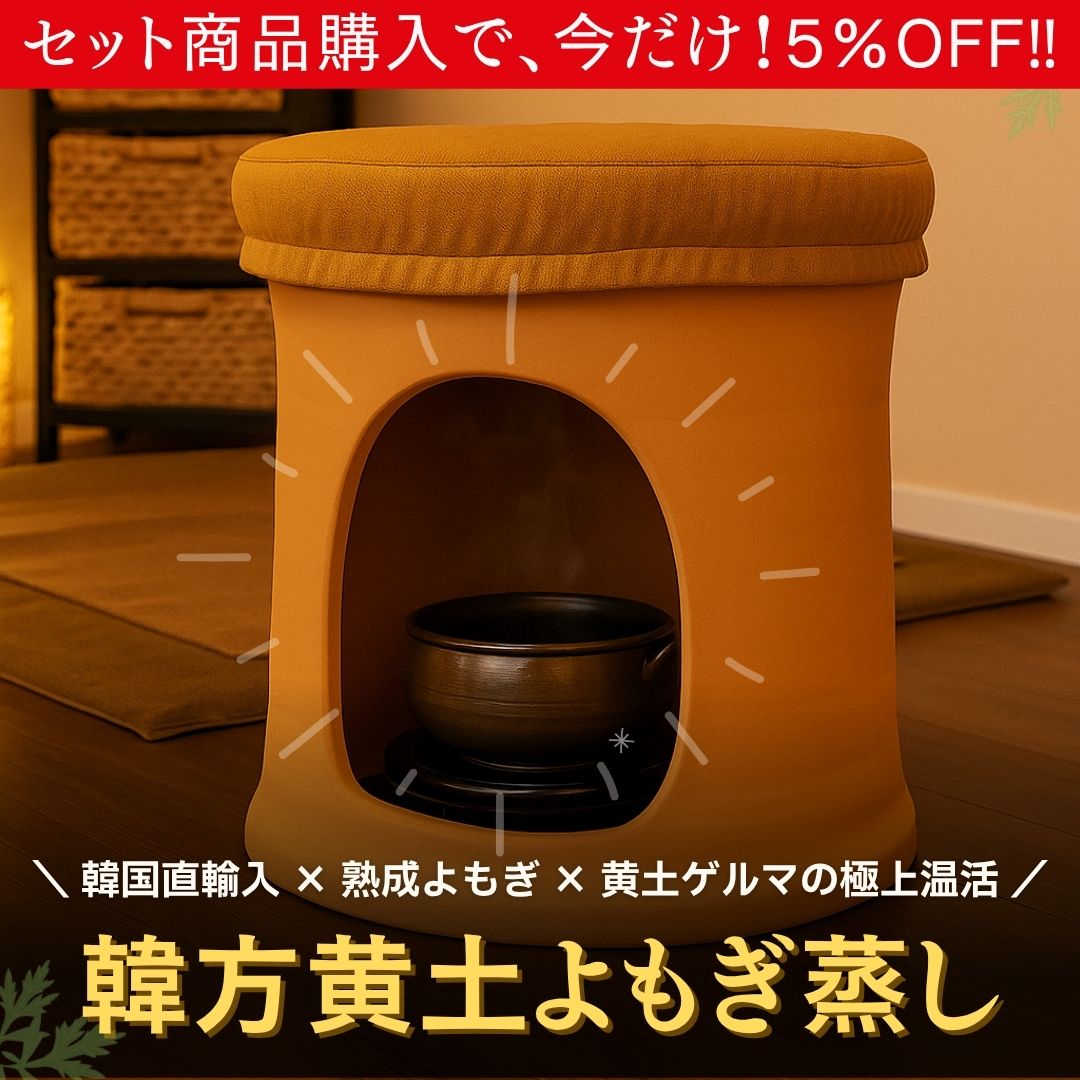 韓国の正規工房製・江華島産3年熟成よもぎ使用の黄土よもぎ蒸しセット。遠赤外線で芯から温める本格温活メニュー。導入1か月で回収、物販展開にも最適なサロン専用モデル。
